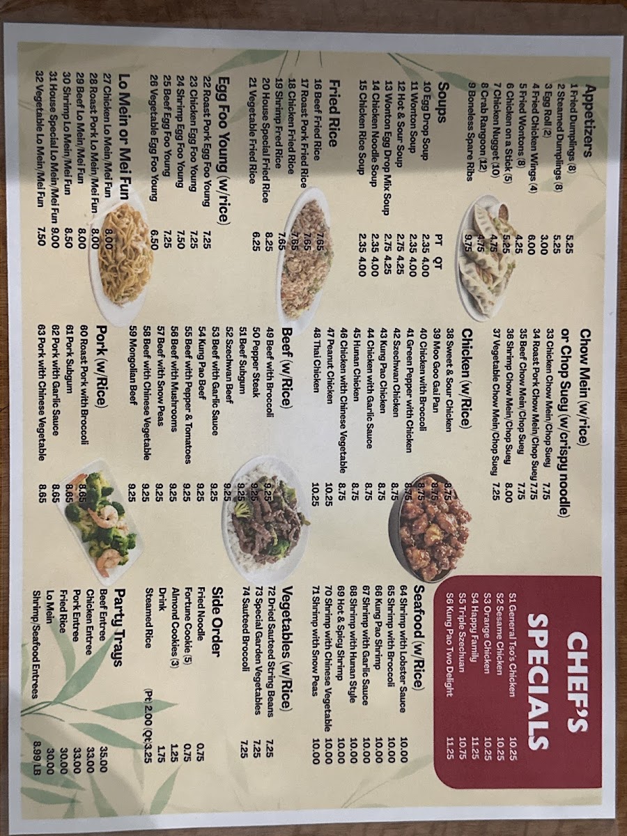 Guests can enjoy hearty special combination plates like Chicken Chow Mein or Beef with Broccoli, alongside vegetable-focused dishes such as sautéed broccoli and garden vegetables. There are also convenient party trays featuring beef, chicken, or pork entrees, perfect for sharing during informal get-togethers. The option of fried rice or lo mein adds a warm, filling touch to any meal.